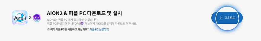 퍼플 PC를 설치한 후 'STORE' 메뉴에서 AION2를 선택해 다운로드 해 주세요.※ 이미 퍼플 PC를 사용하고 계신가요? 퍼플 PC 실행하기